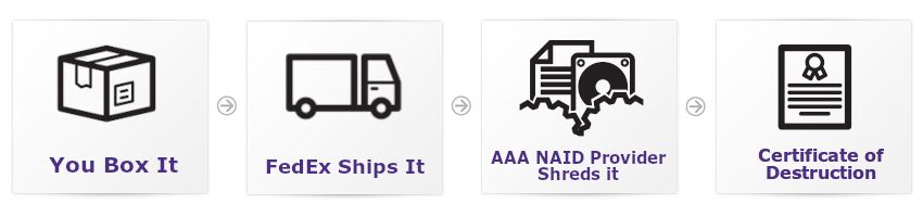 With Ship 'N' Shred, you get a no-contact, hassle-free, trackable solution for secure, small-scale destruction that's also compliant with state and federal privacy laws, including HIPPA, FACTA, GLBA, and EPA guidelines for electronics. And when the destruction process is complete, you'll get a Certificate of Destruction for your records.